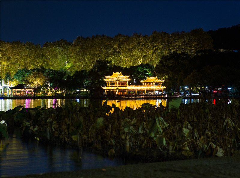 2 杭州夜色下西湖邊上建筑群燈光秀,夢回唐朝
